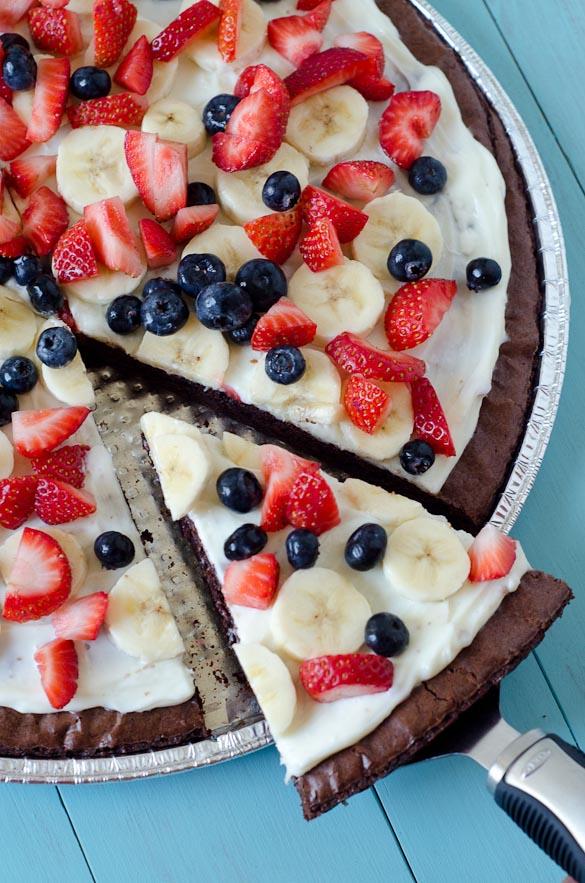 - In a medium bowl, cream together the cream cheese and powdered sugar until smooth. Spread evenly over the top of the cooled brownie round. Slice the bananas and sprinkle with lemon juice to preserve the coloring. Place the banana slices evenly over the top of the cream cheese layer. Sprinkle with strawberries and blueberries.