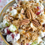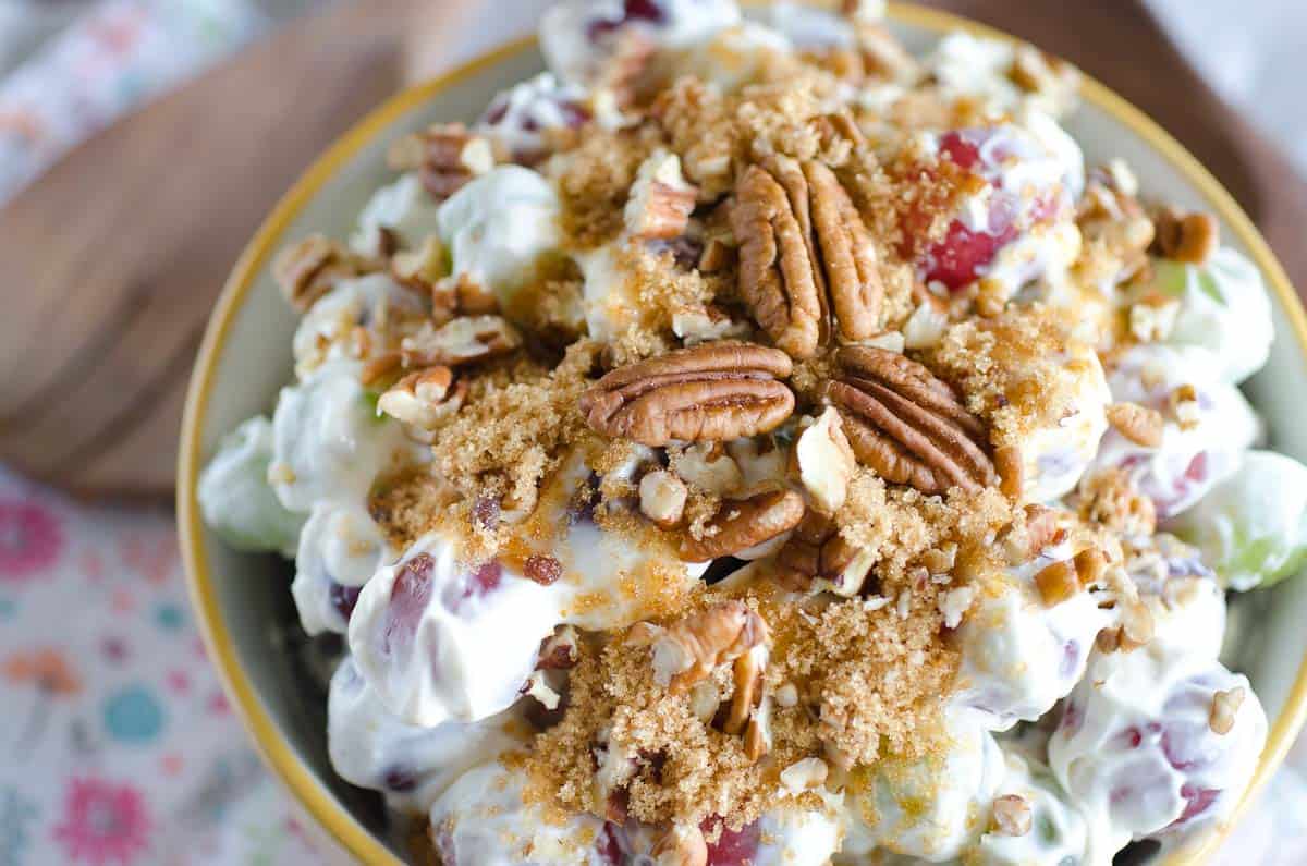 I sometimes serve this in a bowl and other times in a 9x13 dish so the topping can be spread among a larger area of the grapes. Either way is just as great! I saw a photo on Pinterest that one of my readers served her grape salad in a trifle bowl!