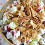 This grape salad is a copycat recipe of Chicken Salad Chick's side dish. This is the BEST creamy grape salad with a crunchy brown sugar pecan topping.