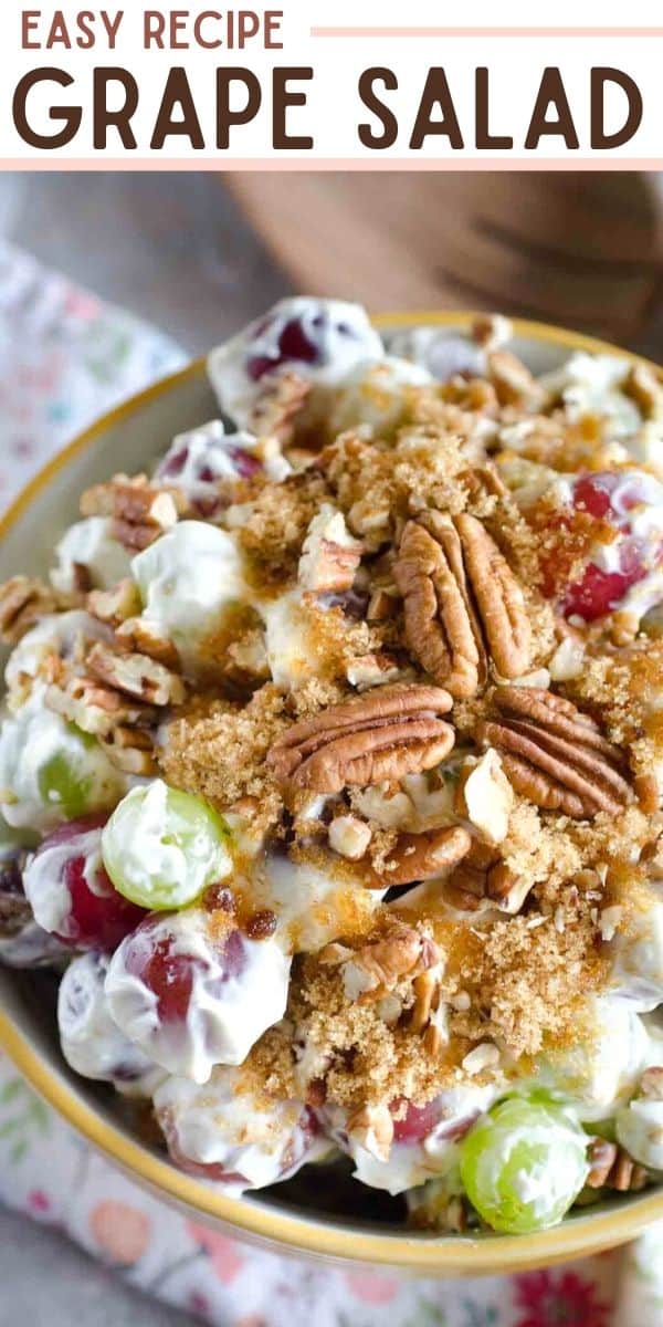 Grape salad is simply green and red grapes mixed into a sweet cream cheese icing and topped with brown sugar and pecans. It's a side dish or a dessert!
