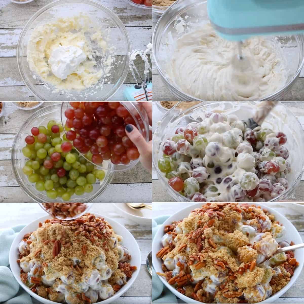 - Using a rubber spatula or wooden spoon, fold the grapes into the bowl of cream cheese mixture. Cover and chill until ready to serve. Right before serving, transfer to serving dish and sprinkle with brown sugar and pecans.