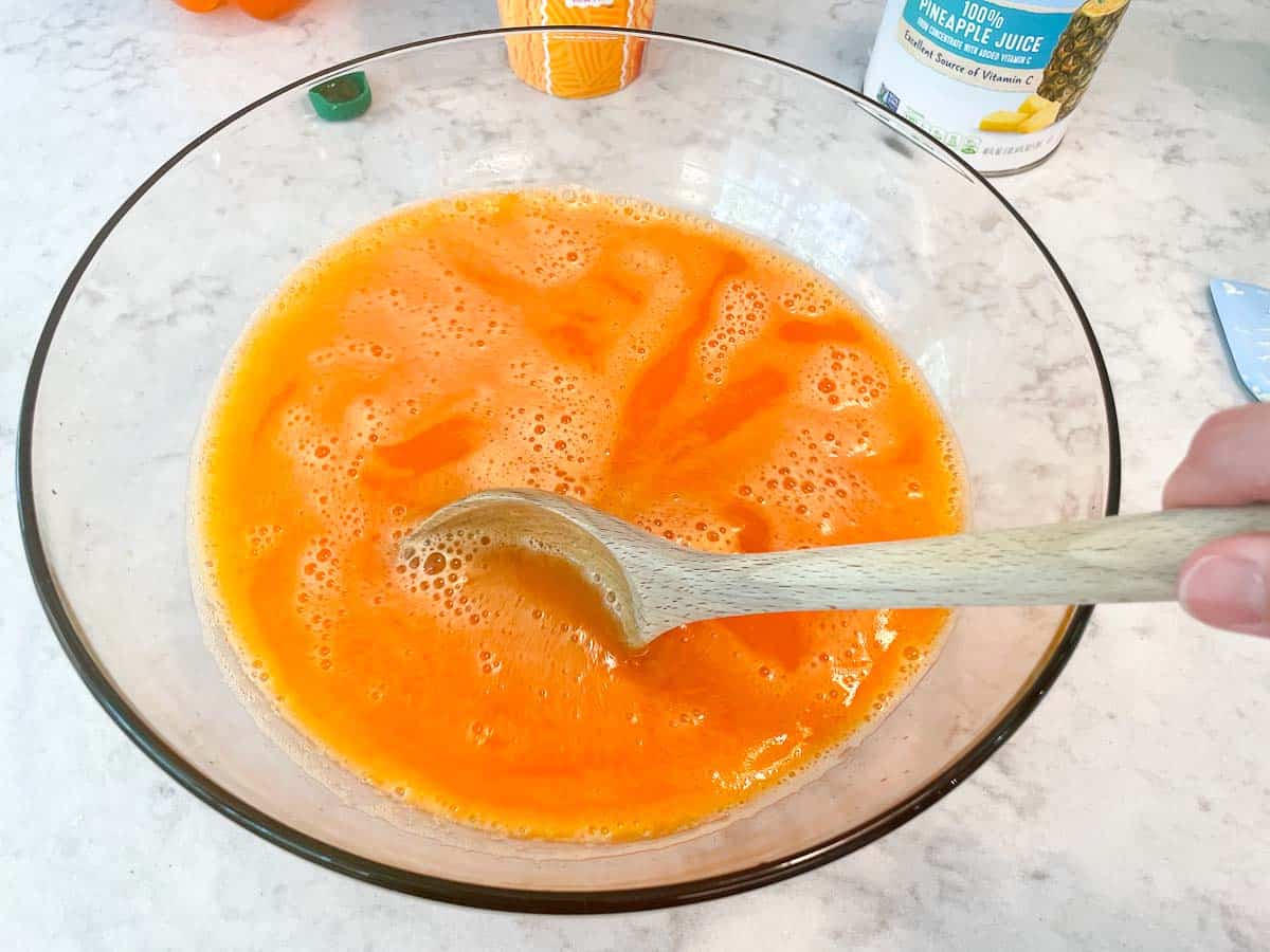 - In a large punch bowl, mix the pineapple juice with the frozen orange juice until thawed.