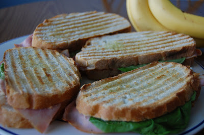 My in-law's were in town last weekend. We made the trek to Madison, WI while they were here to see Ben's brother and wife. Before we got on the road to start our 2 hour drive, I made a quick lunch out of some delicious french bread, maple ham, provolone cheese, lettuce and dijon mustard. Just a sandwich you say? No, a panini!