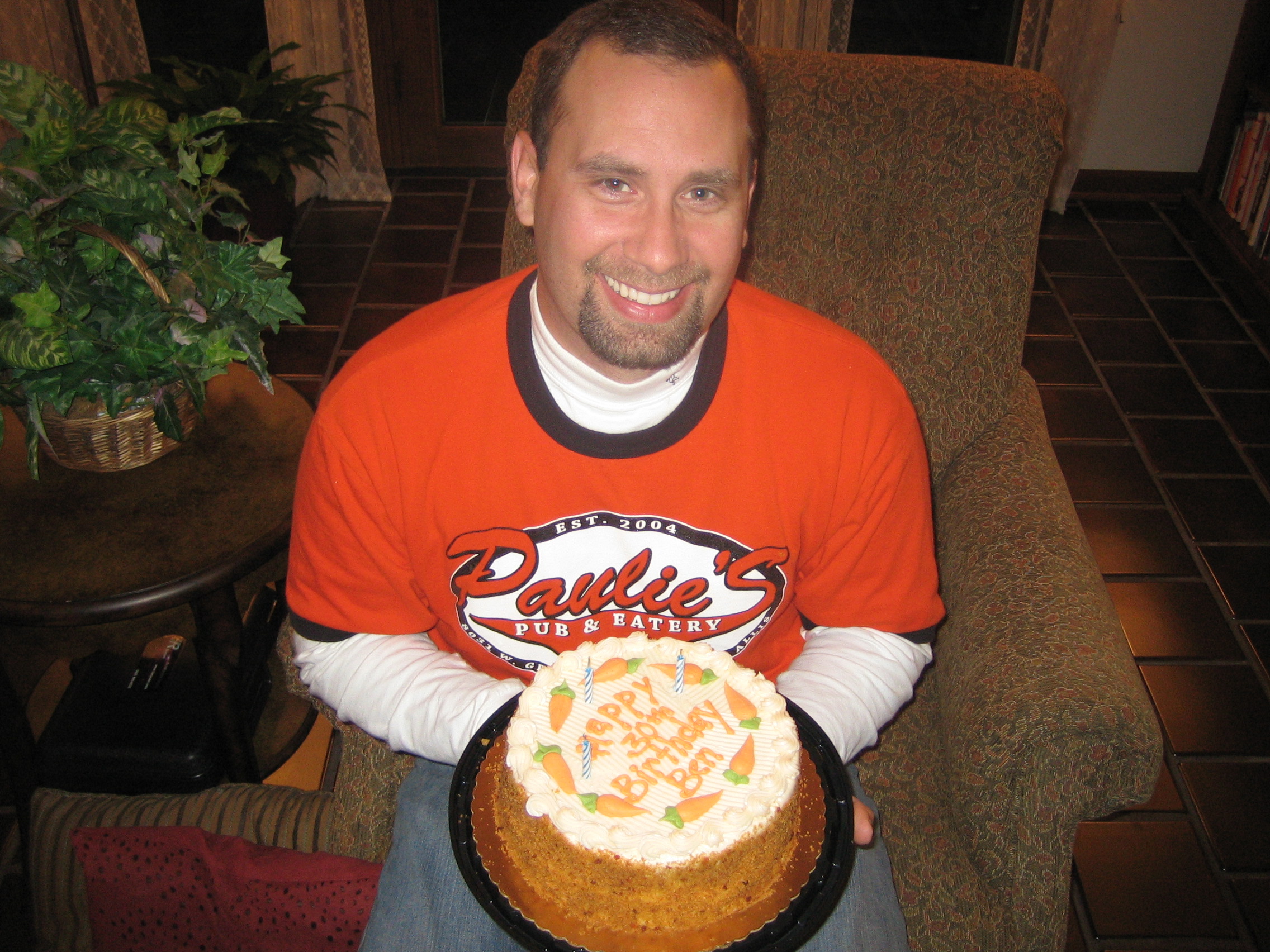 Ben turned 30 years old yesterday. We celebrated with our annual BYOP (Bring Your Own Pumpkin) party, then I planned a surprise party for him later that evening. We finished the night with a gathering at our friend's home to watch the UFC fight and eat this lovely carrot cake. No, I didn't make the cake (thank you Whole Foods) but I did make a bunch of other food for our pumpkin party that I'll post up soon.