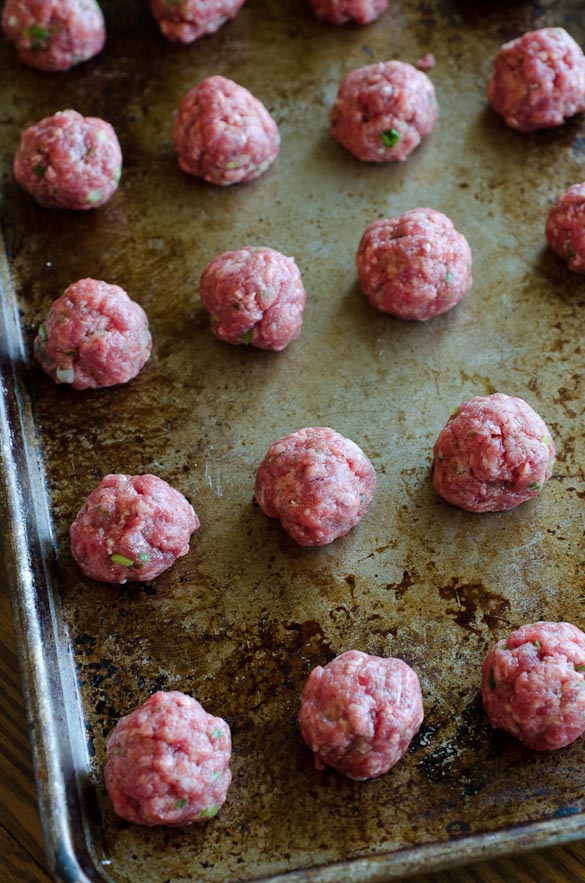- Mix meatball ingredients in a large bowl. Roll into 1 ½-inch balls and place on baking sheet. Bake for 15 minutes, or until done.