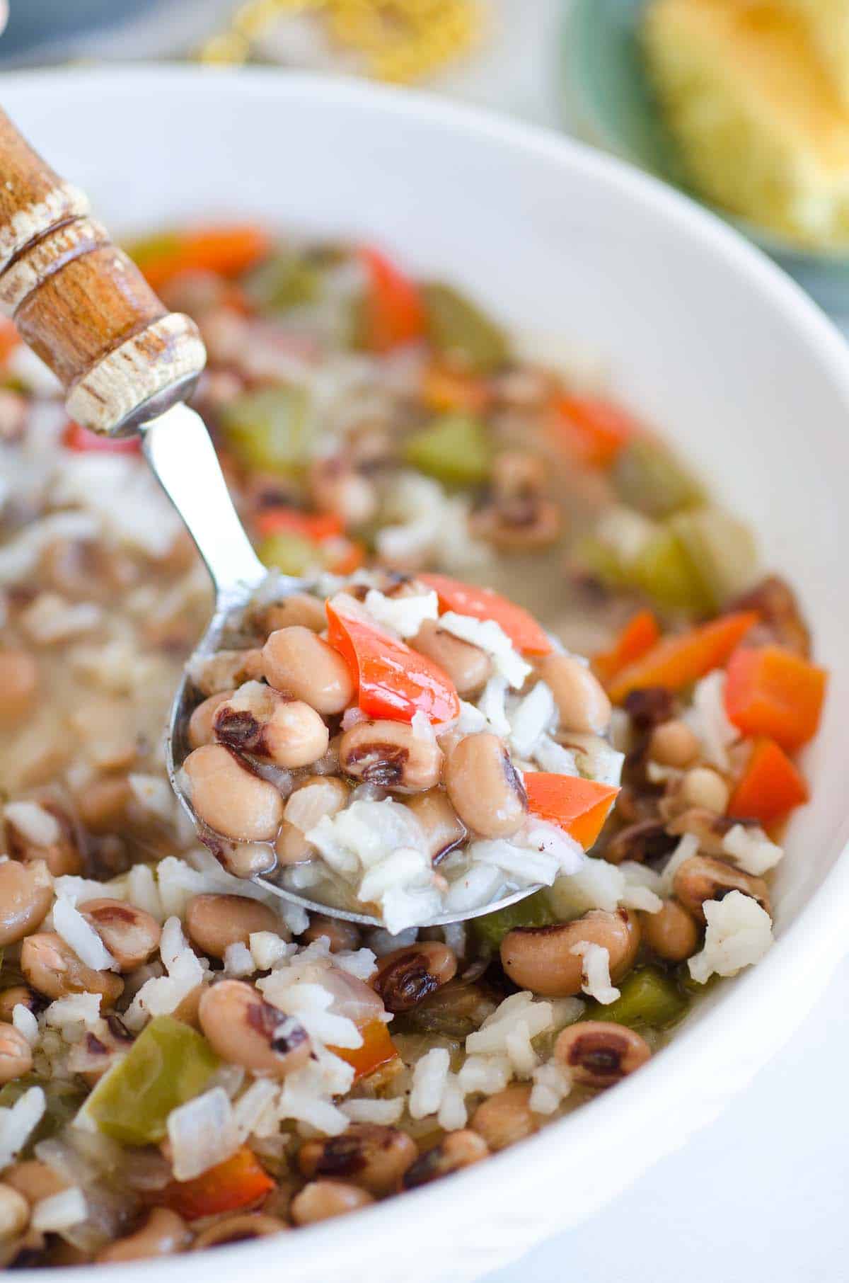 Some may not call this soup, but that's how I like to serve it. Others will serve it over a bed of rice, but I stir the rice right in and ladle it all into a bowl to slurp down. Even though it's tradition to eat hoppin' John on New Years Day, this dish is delicious year round.