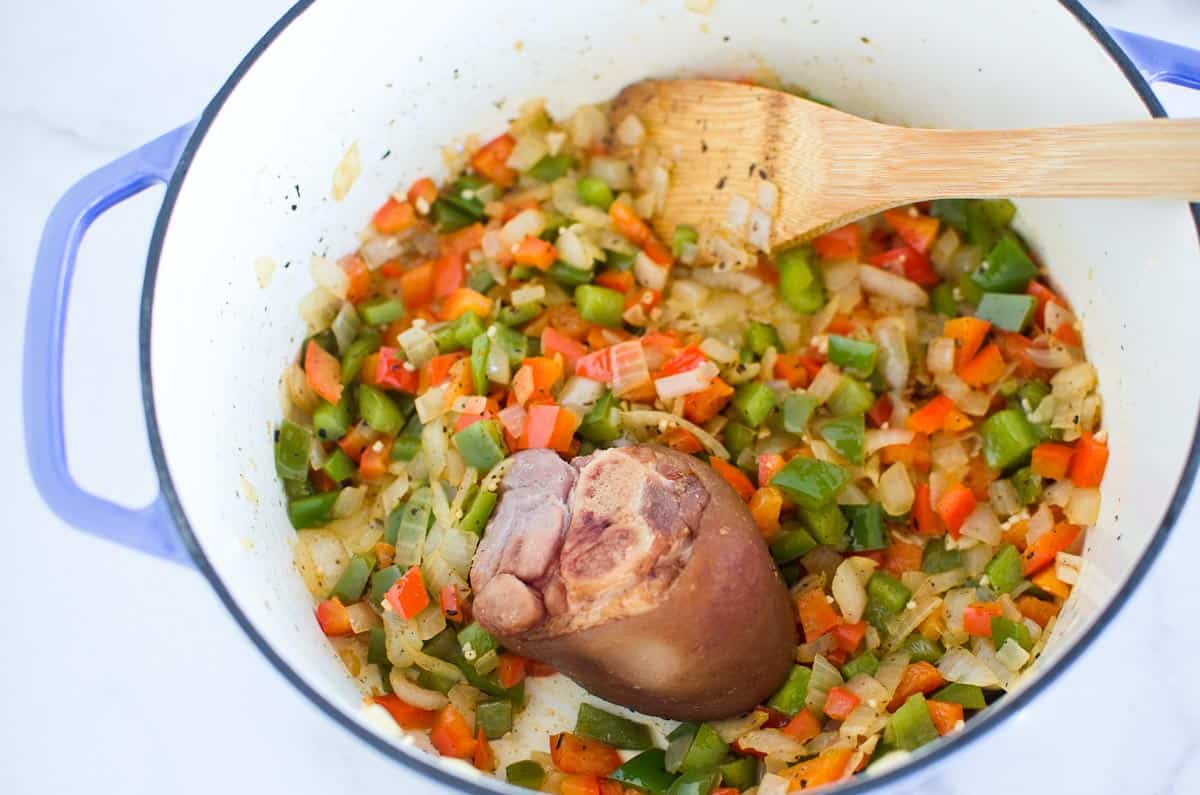 The ham hock may come packaged with more than you need. Use the one closest in size and freeze the others in a freezer bag to use another day. Also, you can see in the photo above I love using my favorite Dutch oven for this dish!