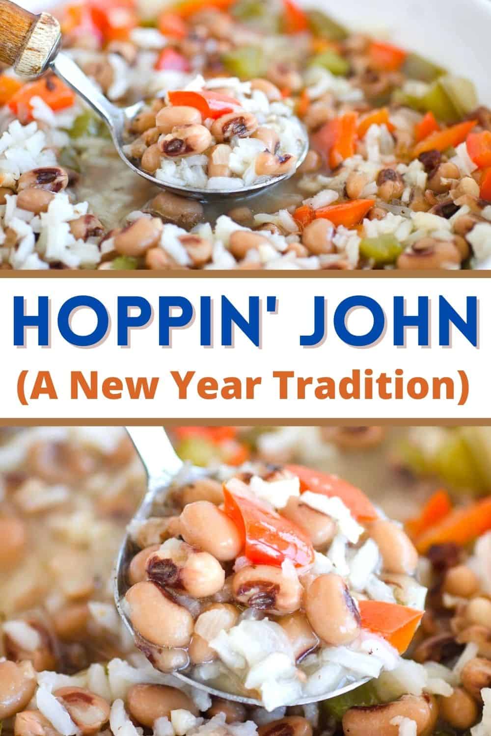 Hoppin' John is a Southern tradition for new years dinner with black eyed peas and rice. Made with a smoky ham hock or salt pork, this black eyed pea soup is believed by some to bring good luck!