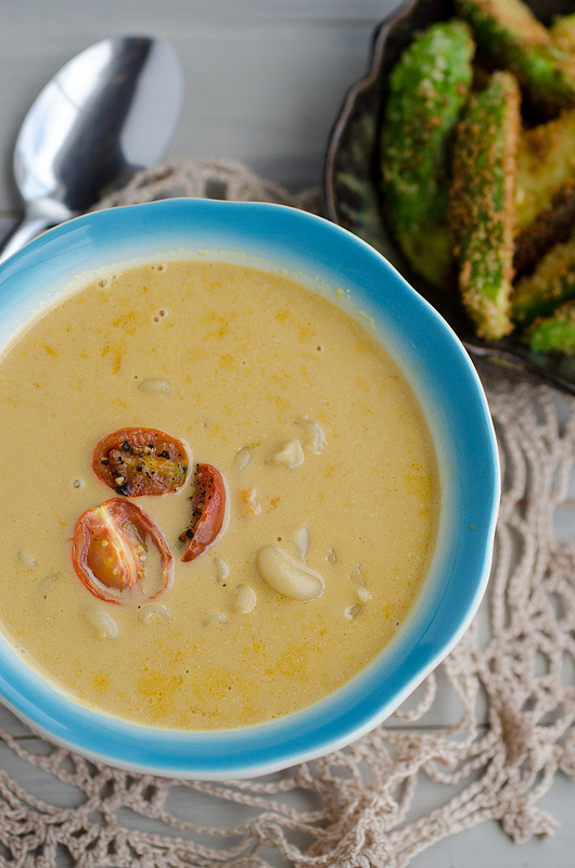 Home » Soup Recipes » Macaroni and Cheese Soup with Roasted Cherry Tomatoes and Avocado Dippers