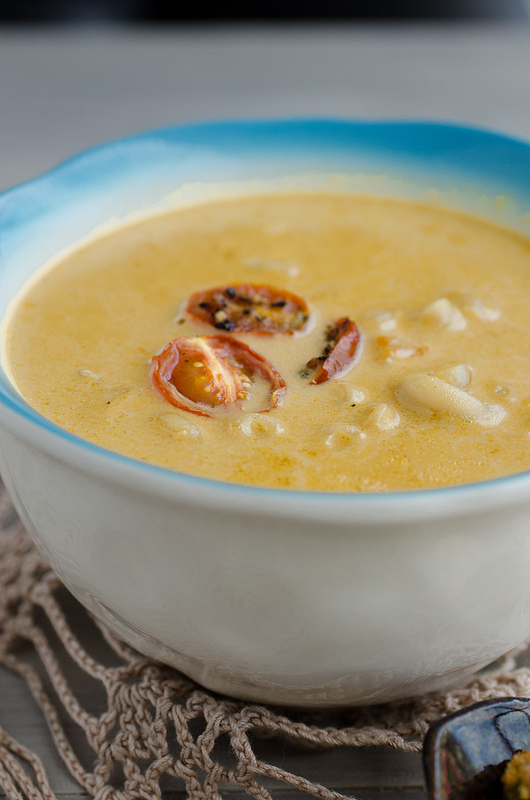 Macaroni and Cheese Soup with Roasted Cherry Tomatoes