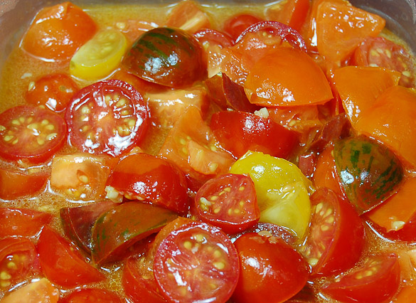 - Heat olive oil in sauce pan over medium heat. Cook garlic, stirring 1-2 minutes until softened, but not burned. Add tomatoes, then cover and cook over low heat for 3-4 minutes until tomatoes soften but still hold their shape.