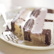 3. Pour half of the ganache (1 cup) evenly into the lined pan and spread to cover the base. Cover the ganache with a single layer of tightly packed cake slices; be sure the layer is flat and even. Working quickly, spread the vanilla ice cream evenly over the pound cake. Cover the ice cream with a layer made of half of the chocolate wafers. Spread the remaining ganache evenly over the wafers, then top the ganache with another layer, using all of the remaining wafers, and place the cake in the freezer for about 30 minutes to chill and firm up.