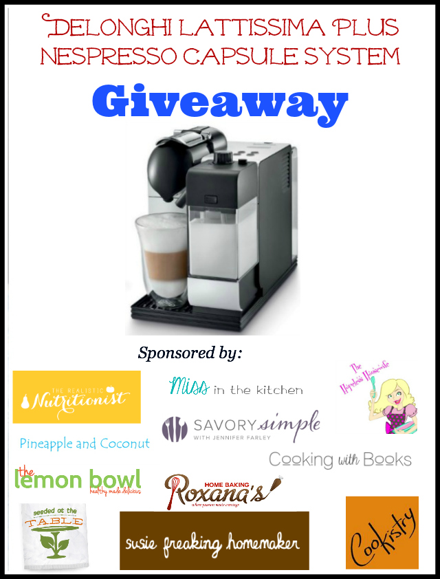 Happy Sunday all!! I'm traveling right now, visiting family in North Carolina, but I haven't forgotten about you! A few bloggers and I teamed up to offer you a sweet giveaway. One of our readers will win this DeLonghi Lattissima Plus Nespresso Capsule System. That's a mouthful! Click on the widget below to enter for your chance to win!