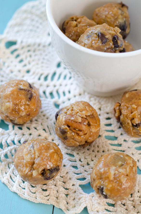 - In a large mixing bowl, combine the peanut butter, honey, vanilla, cinnamon and salt until creamy. Stir in the oats, chocolate chips, coconut, pecans, raisins, flax seed, and chia seeds.