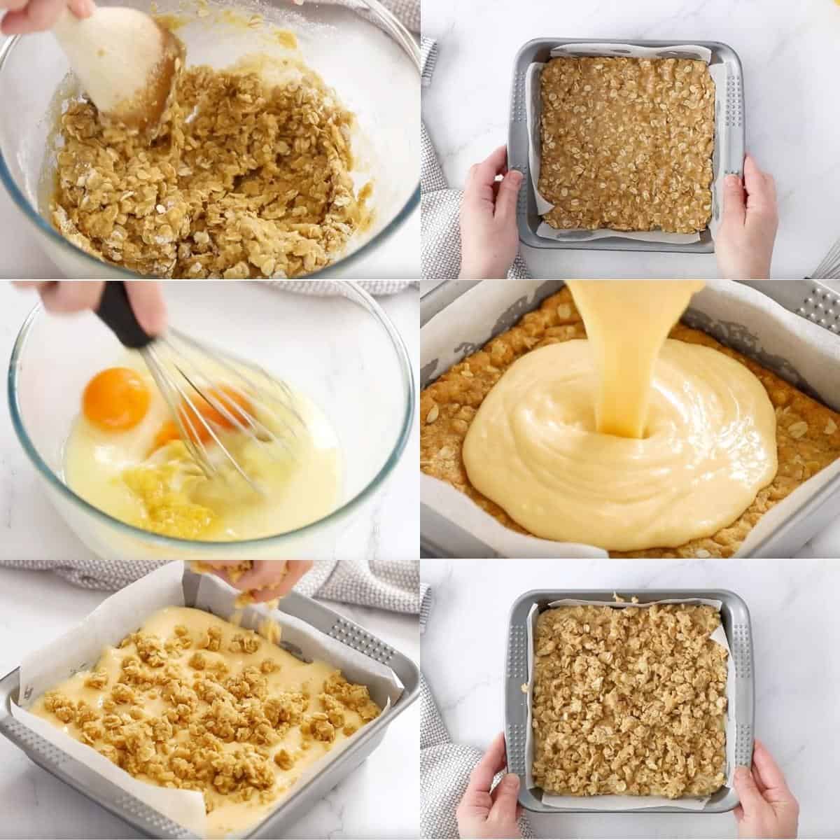 Scroll to the bottom of this post for a full recipe card and step-by-step video on how to make oatmeal lemon bars. The general steps are as follows: