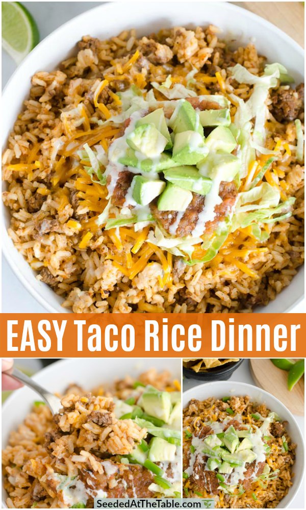 This One Pot Taco Rice Dinner is the perfect family dinner idea. Serve with all the fixins for taco bowls as an easy Mexican recipe!