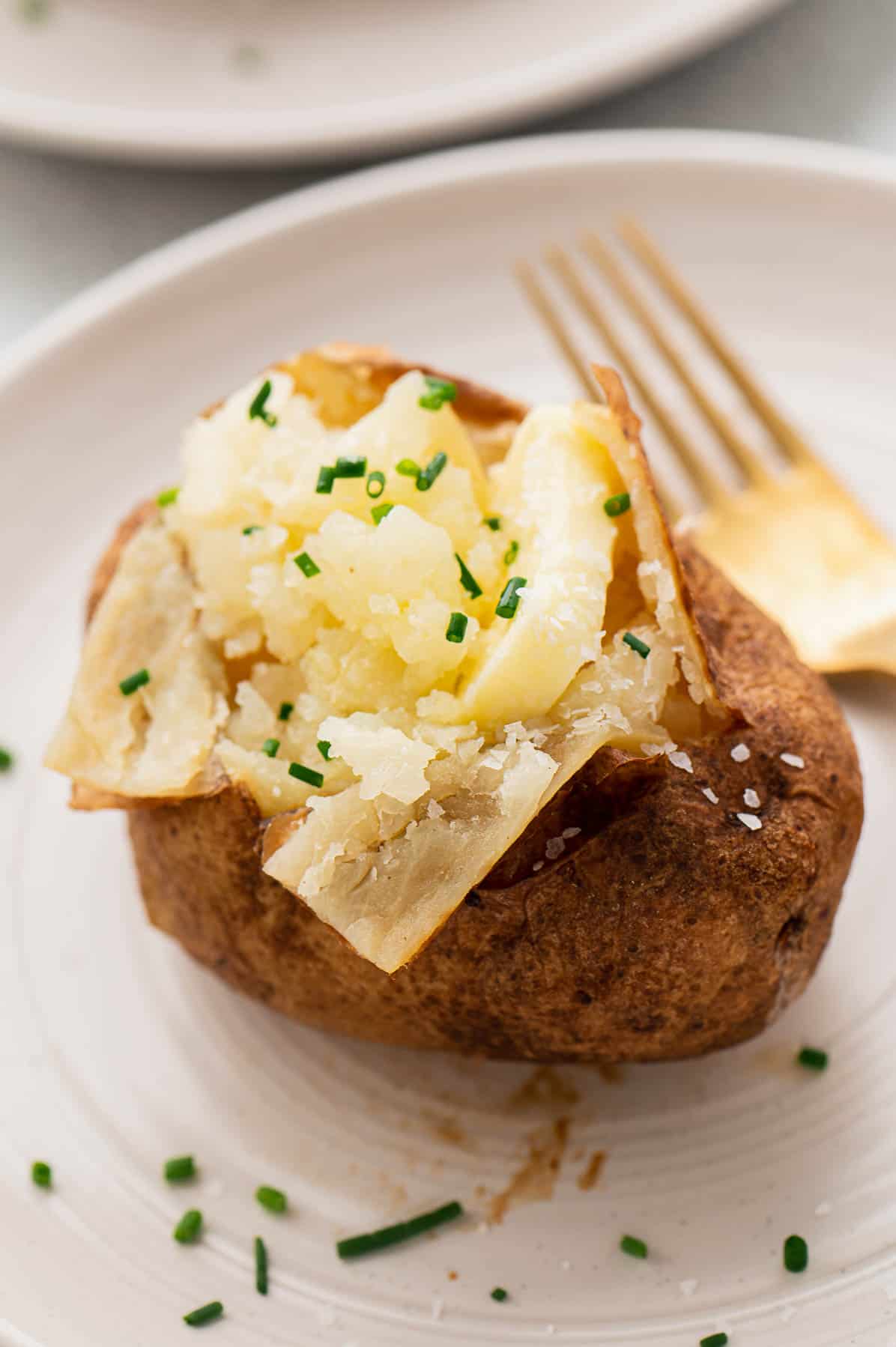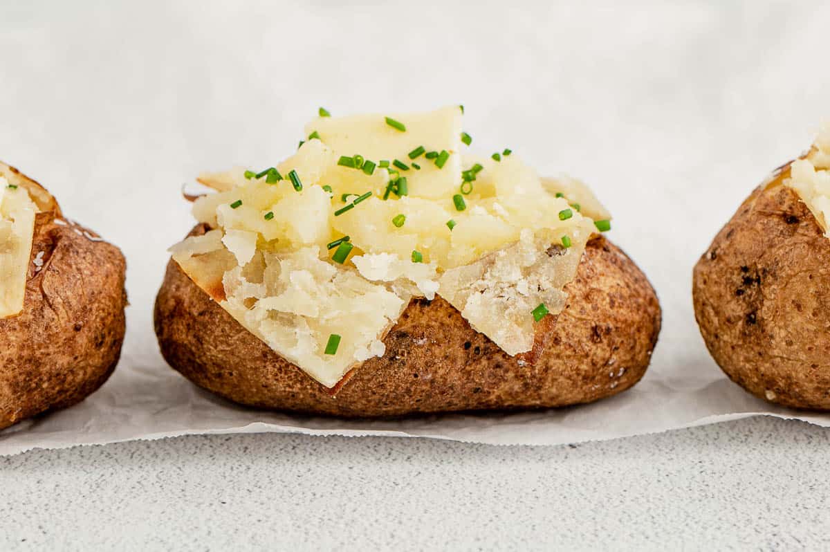 - Serve and Enjoy! When ready to serve, slice an ‘X” in the middle of the potato, and with oven mitts on, squeeze the ends together to open up the potato and fluff. Serve with your desired baked potato toppings.