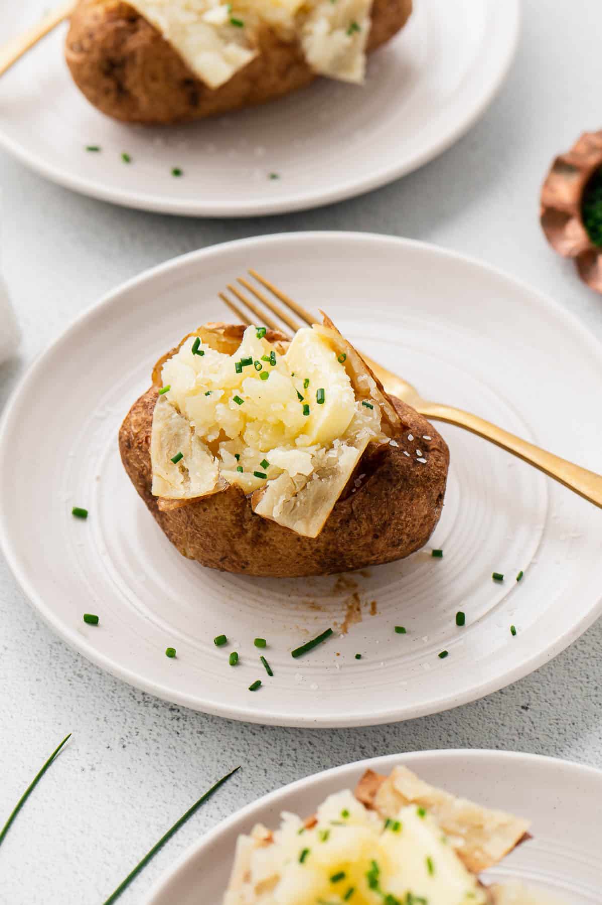 This oven baked potato recipe has been tested again and again, resulting in the perfect salty, crispy skin and fluffy inside. This quick and easy recipe will show you how to bake potatoes in the oven, no baking sheet required!
