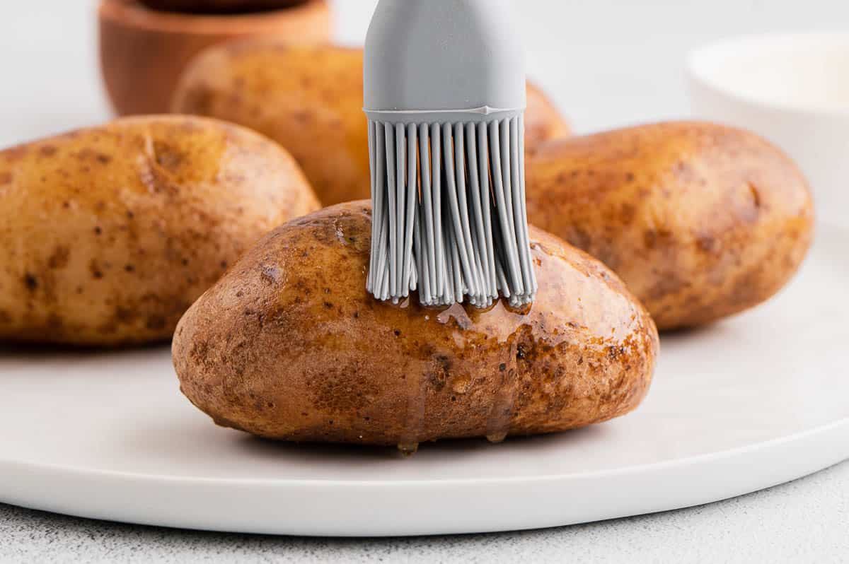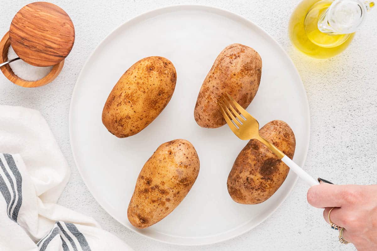 - Poking the potatoes with a fork to create tiny holes allows the steam to escape while they are in the oven, creating the perfect texture inside. This will prevent your potatoes from exploding and creating a mess, so do not skip this step.