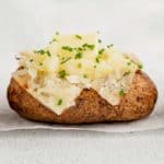 - When ready to serve, slice an ‘X” in the middle of the potato and with oven mitts on, squeeze the ends together to open up the potato and fluff. Serve with desired toppings.