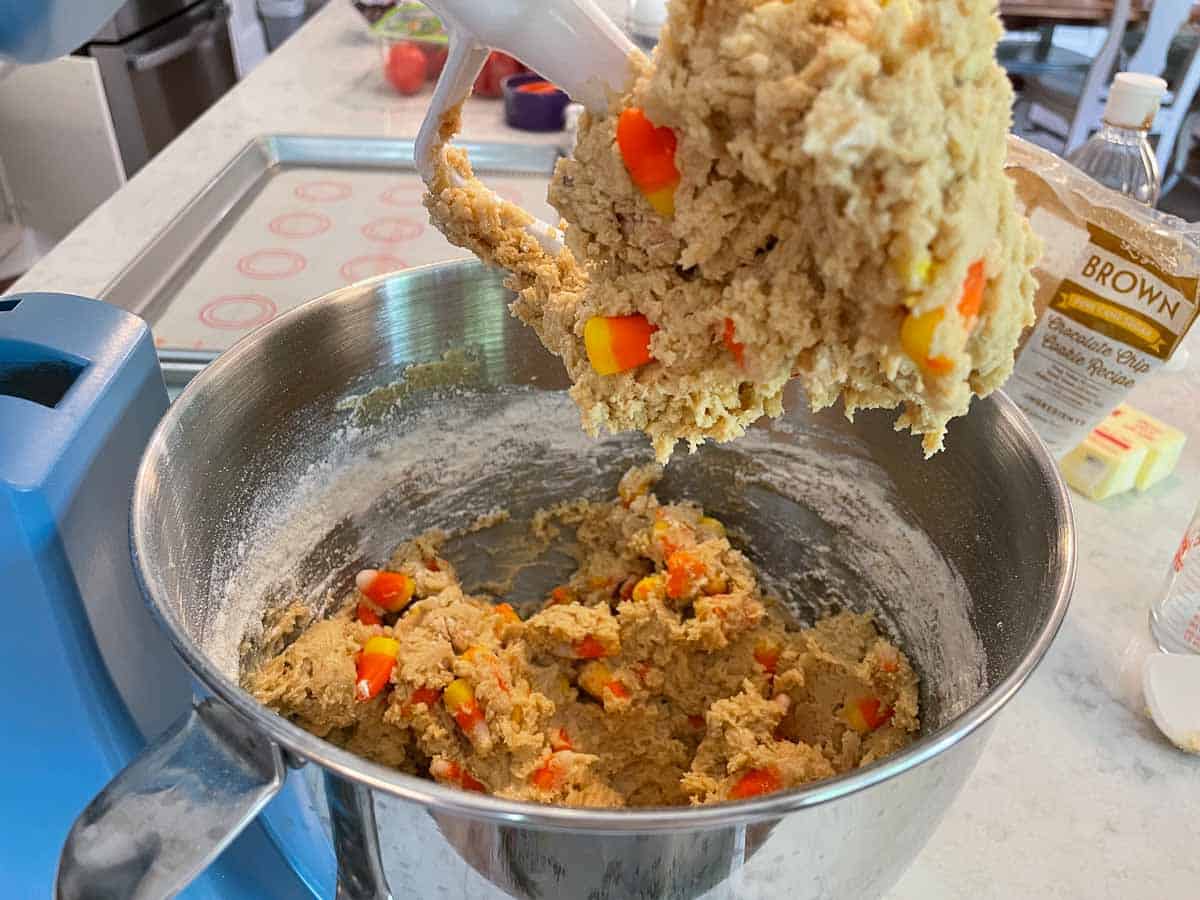 - Do not over-mix the dough. Traces of flour in the dough is fine before adding the candy corn pieces.