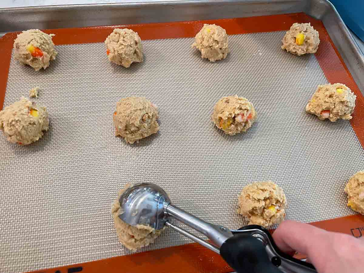 - Shape the cookies. Using a medium cookie scoop, drop 1 ½ -inch dough balls.