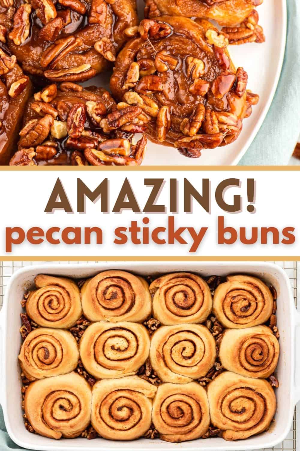 Pecan cinnamon rolls are our favorite gooey sticky buns for weekend and holiday brunch. These cinnamon rolls start with an easy homemade dough and baked with a delicious caramel pecan topping.