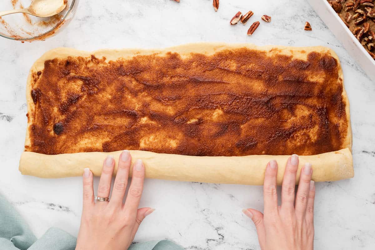 - Starting with the long side, roll the dough into a log. Cut into 12 even rolls.