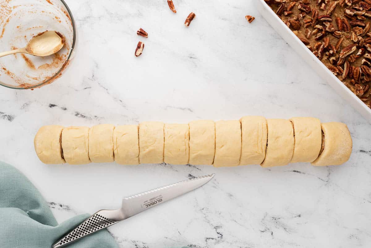 - Roll dough into a log and cut into 12 rolls.