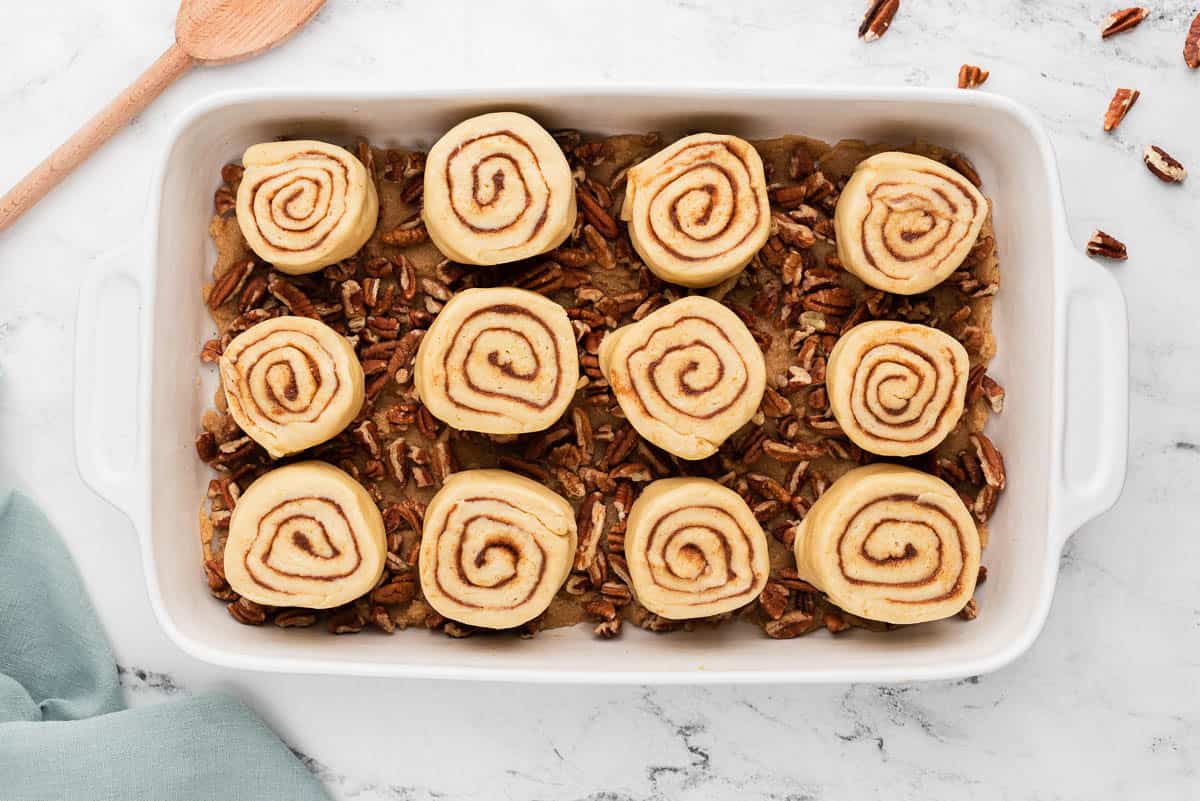 - Place the rolls in the pan on top of the pecans. Cover with plastic wrap and let rise 30 minutes.