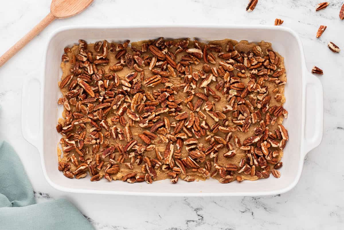 - Spread mixture evenly into bottom of prepared pan. Sprinkle pecans evenly over top.
