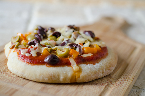 - Spread the pizza sauce over the surface of each of the pita breads. Top with the olives, peppers and cheese. Bake on a baking sheet or stone for 5 to 8 minutes, or until the cheese is melted and bubbly. Garnish with basil, if desired.