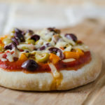 The original recipe calls for a thin crust pizza dough, but I couldn't steer my mind away from making individual sized pizzas over some homemade pita bread. Plus, what a great use of the pita bread that was starting to get a little too old in my freezer! You can definitely use store-bought pita bread, too. These little pizzas are thrown together within minutes and appear on your table-top in no time!
