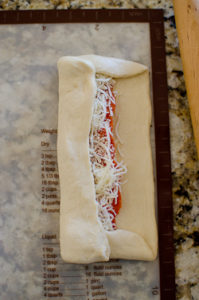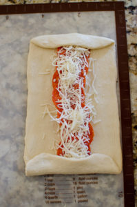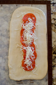 - Layer a tablespoon of cheese right down the middle, then 6-8 pepperoni slices. Top with another tablespoon or two of cheese.