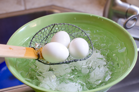 - When your timer hits 10 minutes, immediately remove the eggs from the pot to the bowl with ice water. This stops the eggs from cooking and cools them quickly so they will not turn green inside. Let them stay in the bowl until cooled, for at least 5 minutes (longer if cooking a larger amount of eggs).