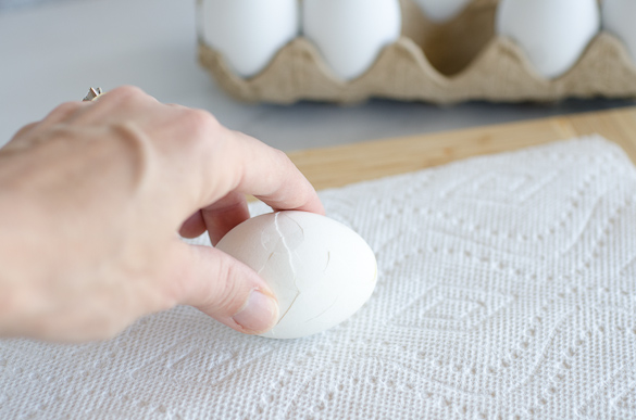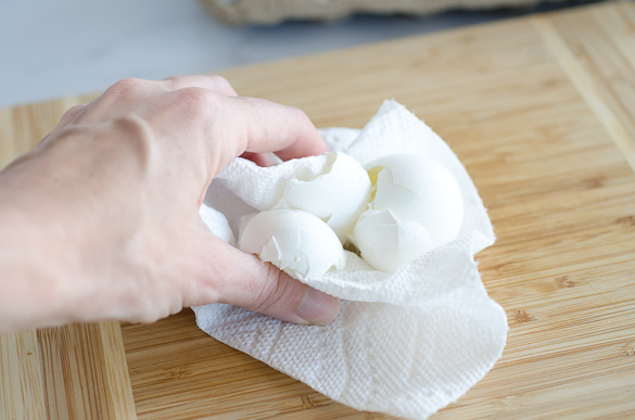 - Peel eggs over a paper towel for easy clean up.