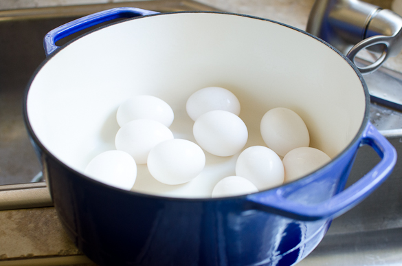 - Place eggs in a pot in a single layer. For my large Dutch oven, I typically boil up to 12 eggs. For a smaller pot I will do around 6 eggs at a time. You can do more or less, but that's what I tend to do.