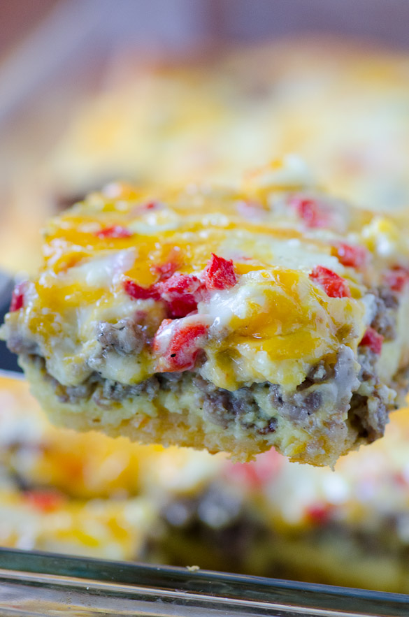 This cheesy sausage breakfast casserole is picked up a notch with southern pimento cheese and a flaky crust of refrigerated crescent dough.