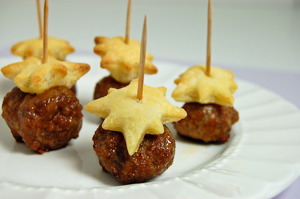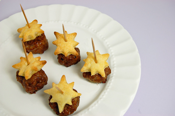 - Spread the pastry onto a large work surface and lightly brush the top with egg wash. Using a mini cookie cutter (I used a star) cut out 36 shapes from the pastry. Line the meat onto a baking sheet and cover each one with a pastry shape and secure in place with a tooth pick. Bake for 18-20 minutes.