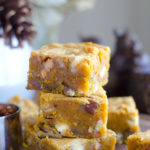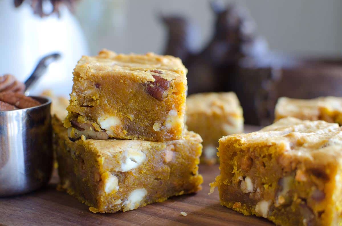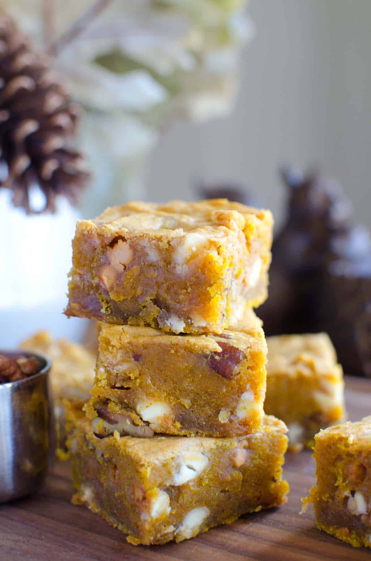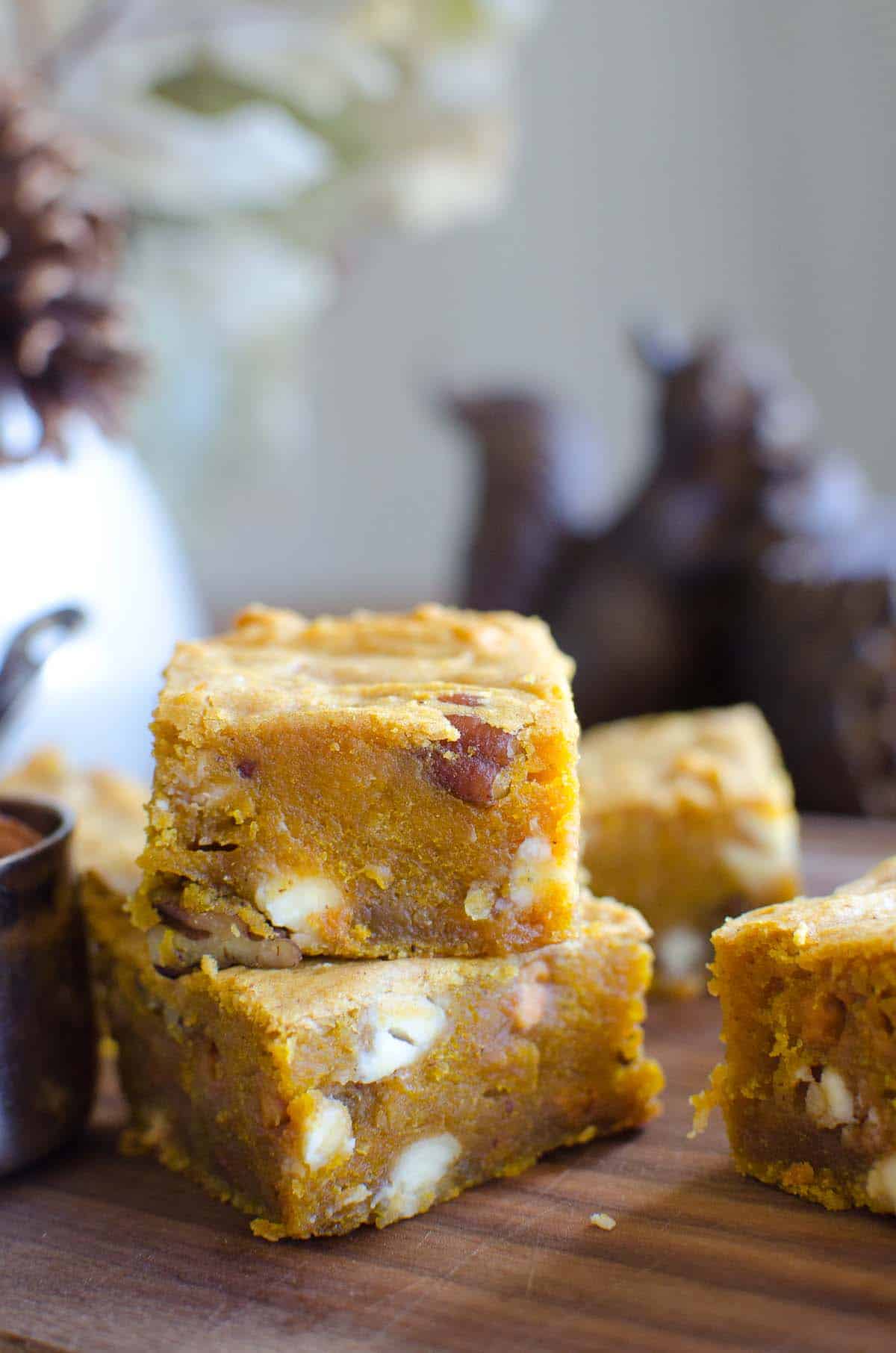 These pumpkin blondies are loaded with rich flavors of fall and a thick gooey texture. Cookie bars packed with white chocolate chips, butterscotch chips and pecans.