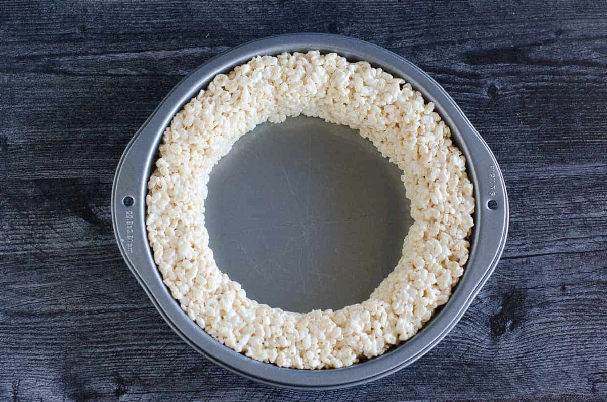 - Press marshmallow mixture into the edges of the cake pan to form a 1-inch crust. (Use wax paper to help press without sticking. The more the cereal cools, the less sticky and easier to press.) Set aside and let cool while making the filling.