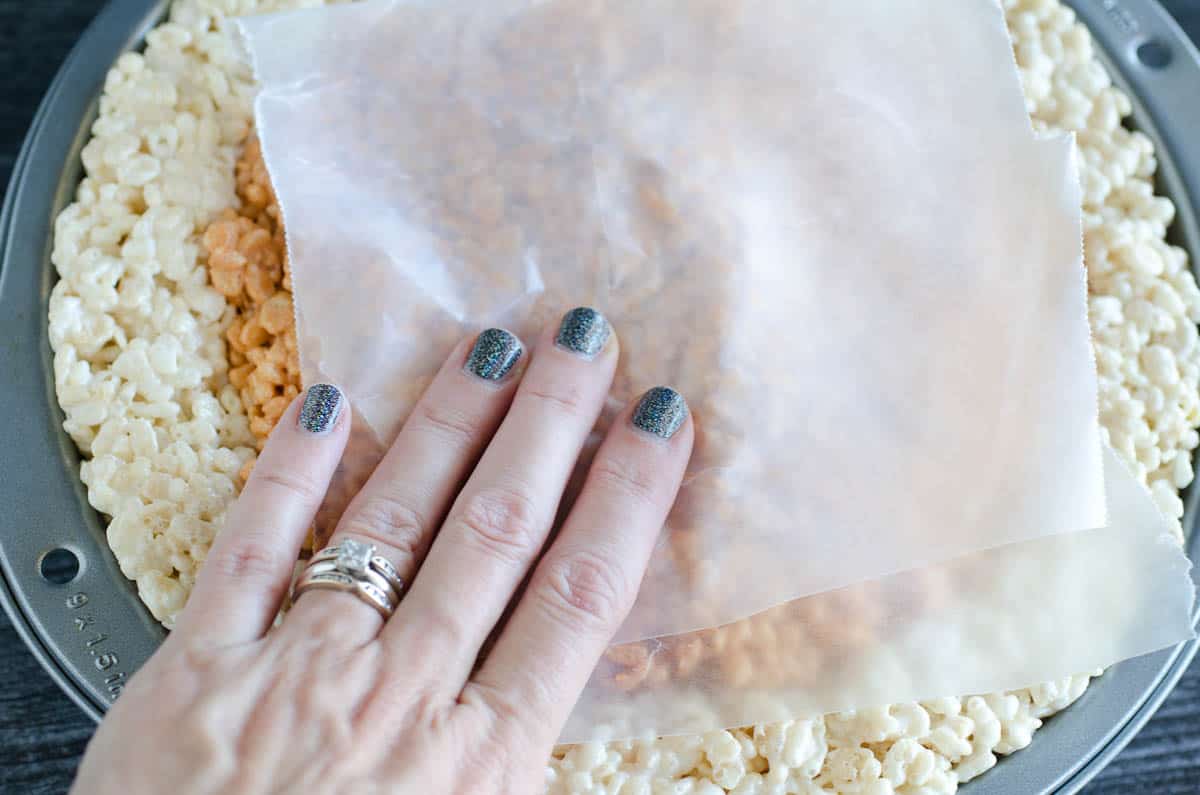 - Press into the middle of the cake pan. Use wax paper to help.