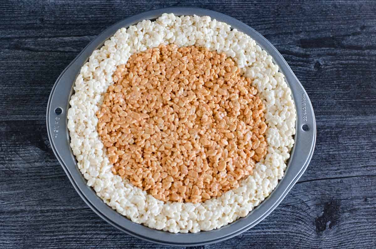 The "crust" for this pumpkin pie is your standard marshmallow treats shaped into the edges of a round cake pan.