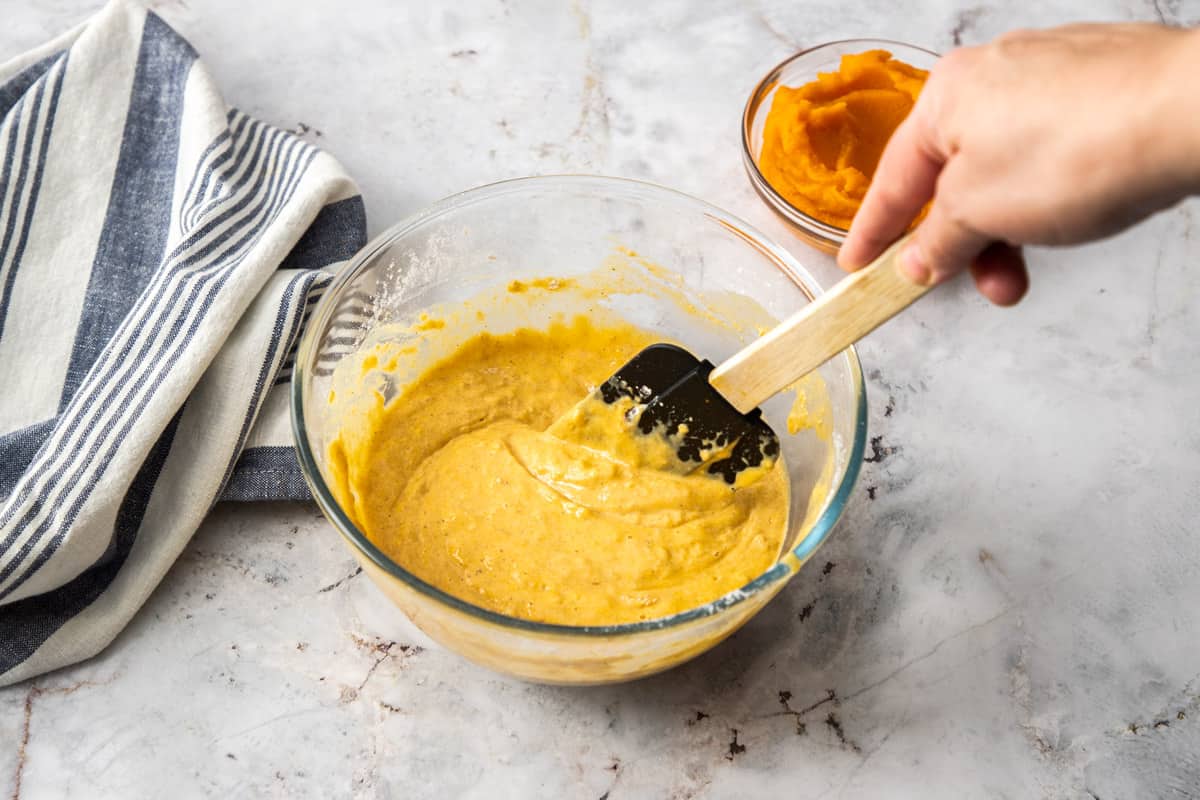- Whisk together the flour, sugar, baking powder, salt and spices in a medium bowl. Make sure to blot out any chunks of brown sugar. In a separate small bowl, combine the milk, pumpkin, egg and oil or butter. Stir into the dry ingredients and mix until just combined. The batter may still be lumpy.