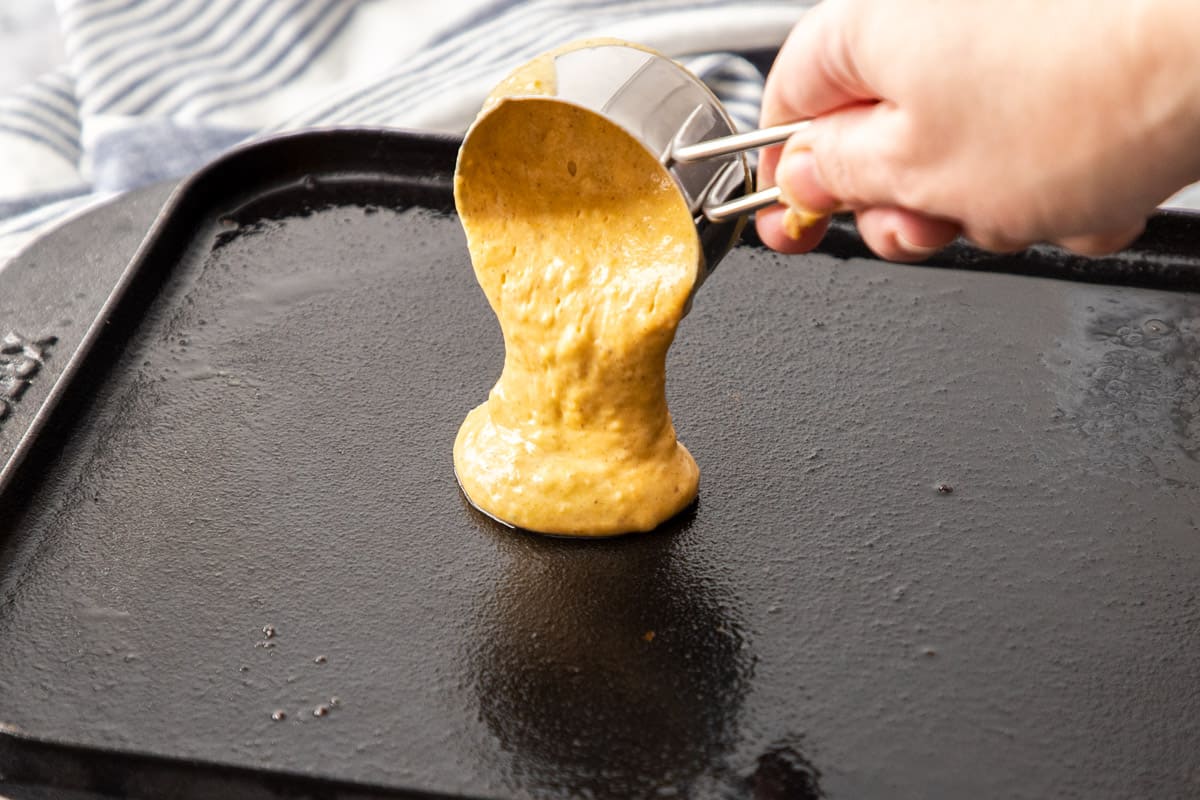 - Heat a skillet or griddle over medium heat (325˚F for the griddle). Spray hot surface with cooking spray. Pour batter on heated surface in ⅓ cup portions. Use the back of the spoon or measuring cup to smooth the batter into desired circle shape. When bubbles start forming on the top and looks dry, carefully use a spatula to flip to the other side. Let cook for a few more minutes until golden brown.