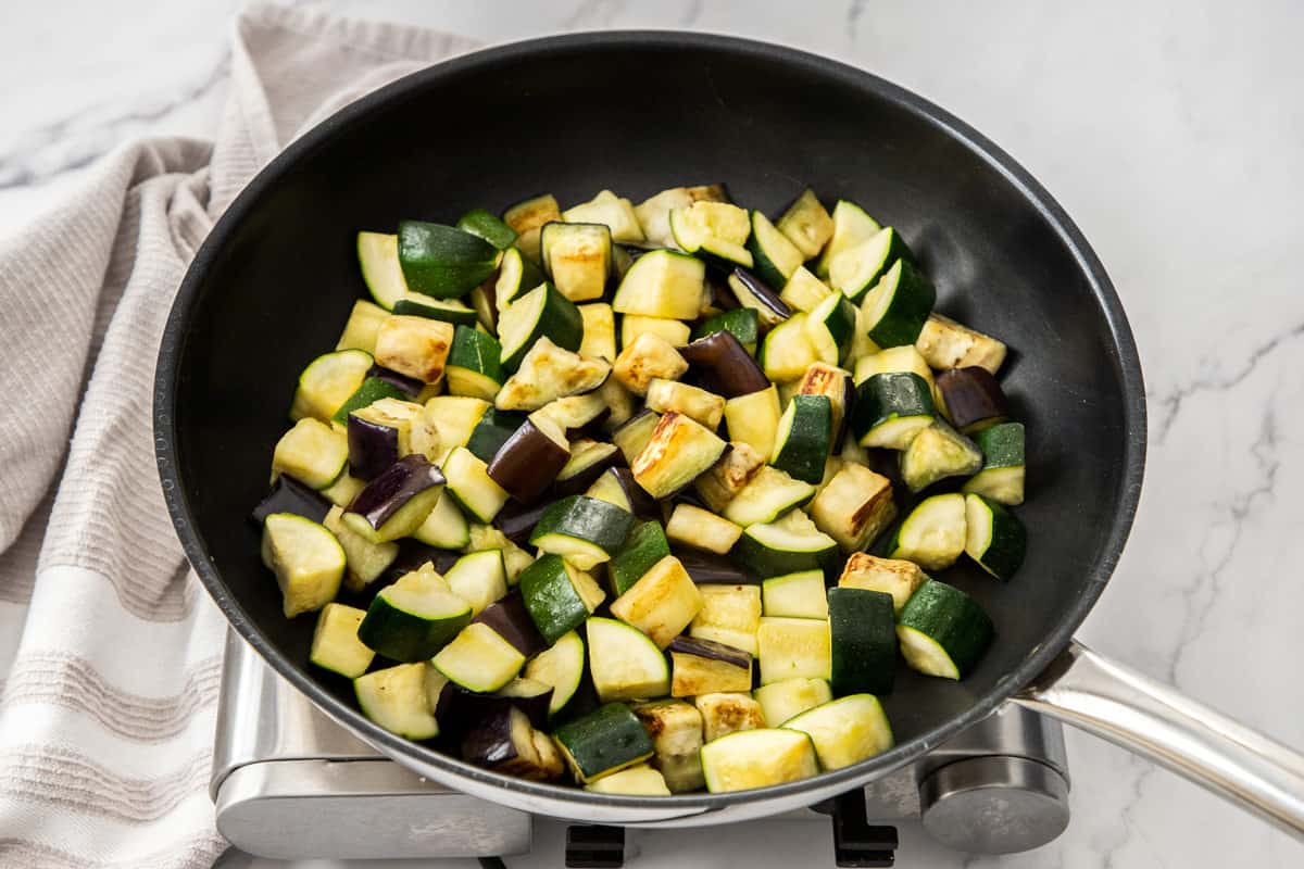 - Heat oil in large skillet. Fry eggplant for 7 minutes. Add zucchini and cook another 4 minutes.