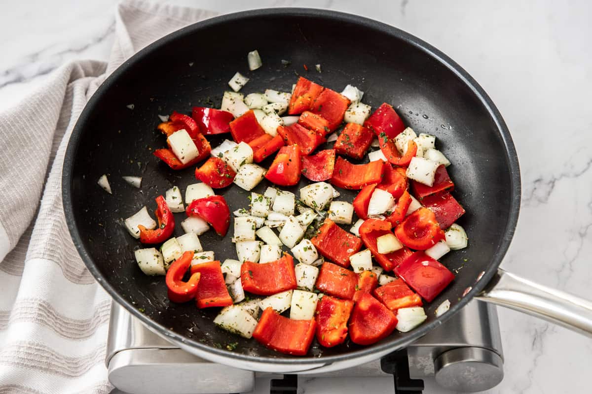 - To the same pan, heat more oil. Cook onions and peppers with the herb seasonings. Add garlic.