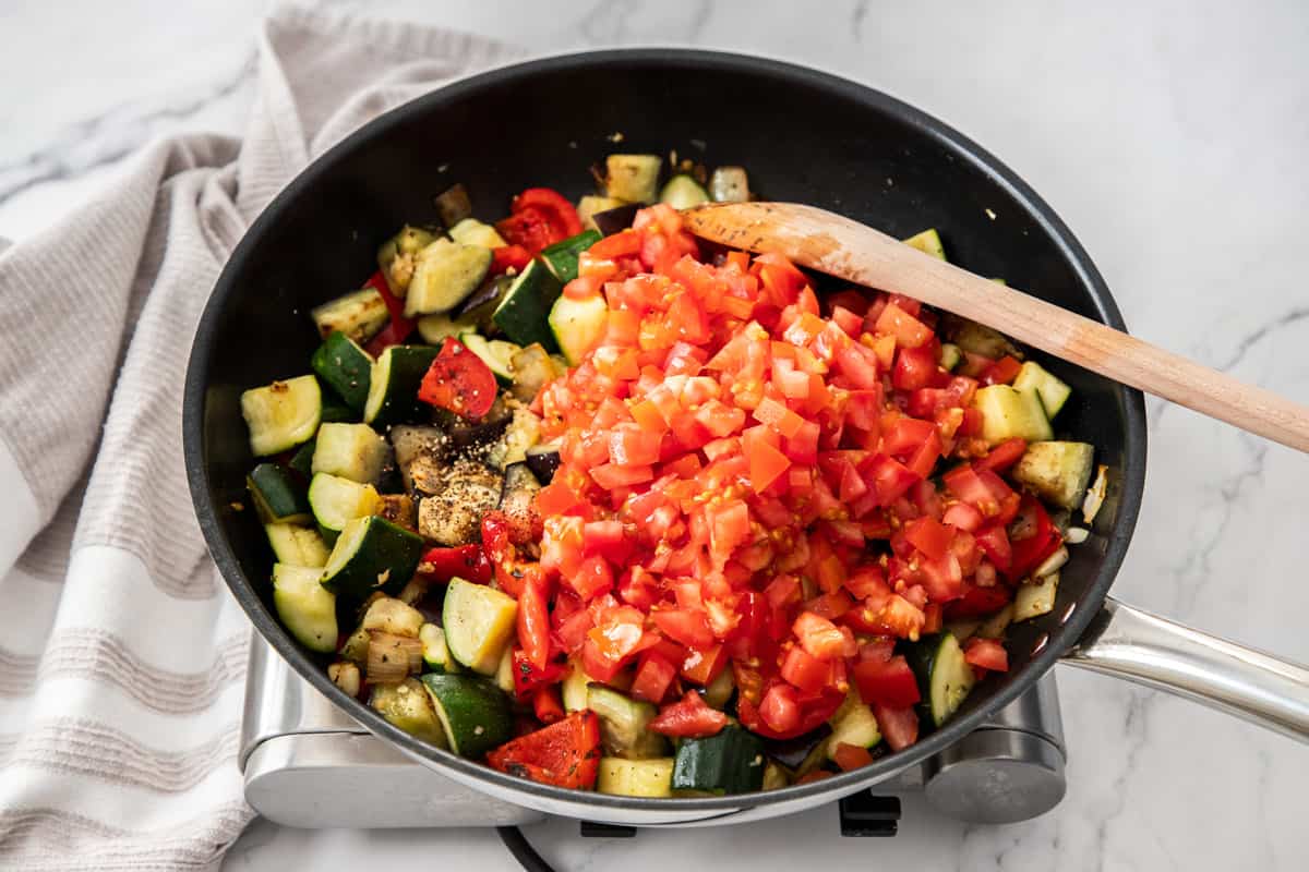 - Return eggplant and zucchini to the pan. Stir in tomatoes, oil, salt and pepper.