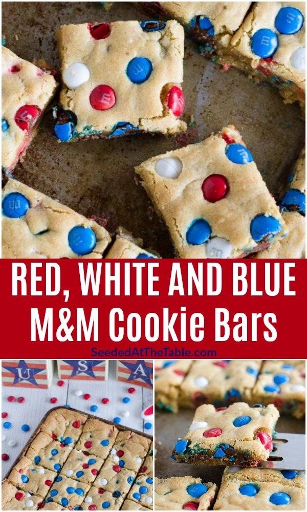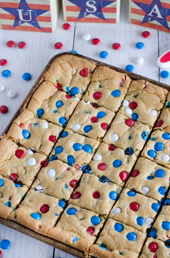 These cookie bars have red white and blue M&M's studded throughout for a patriotic M&M cookie recipe! Everyone loves these soft chewy American cookies!