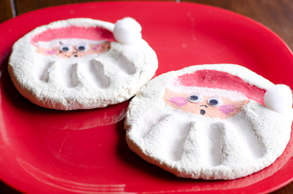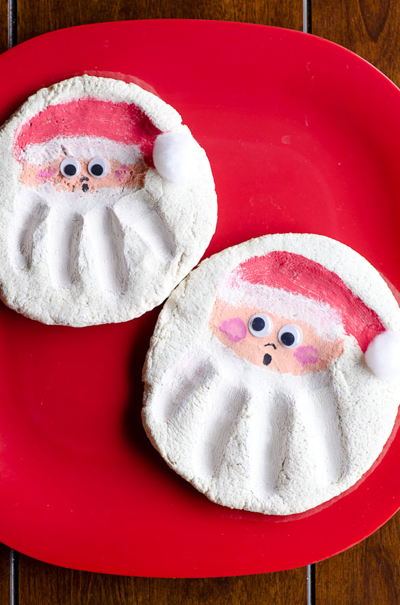 These salt dough handprints painted as Santa Claus are the ideal Christmas craft for your kids! Wrap them up and give them to Grandma and Grandpa as an EASY homemade Christmas gift!